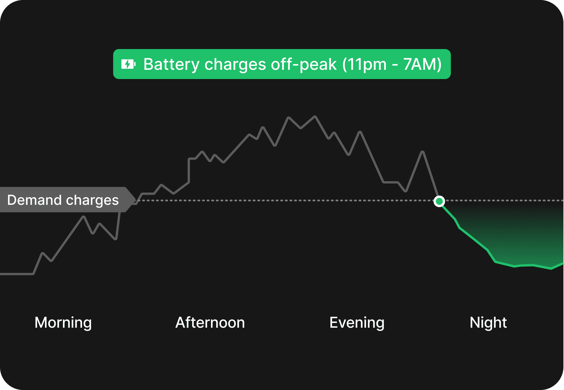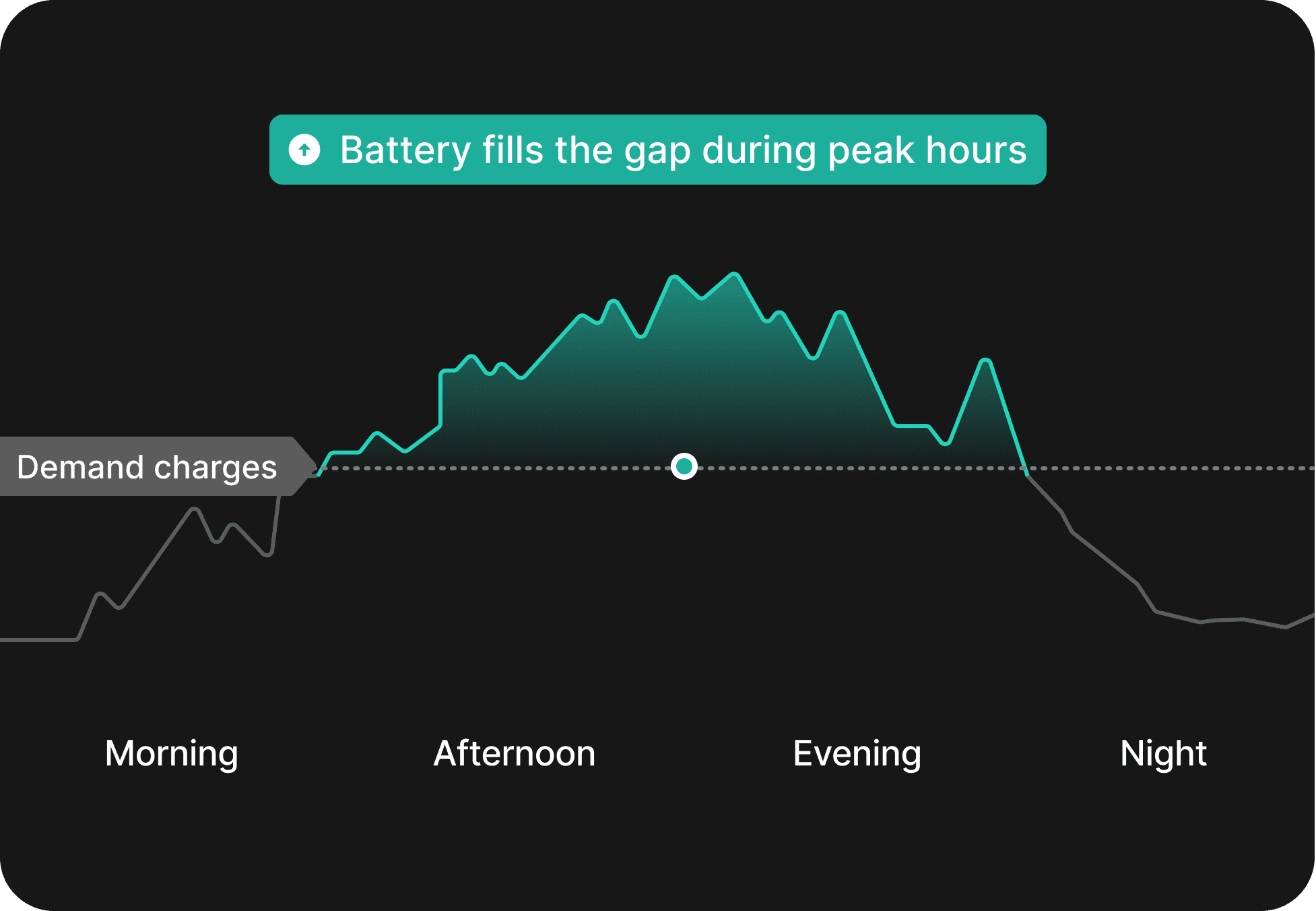 During peak hours, the battery discharges to fill the gap. Your grid demand stays flat, avoiding peak charges.
