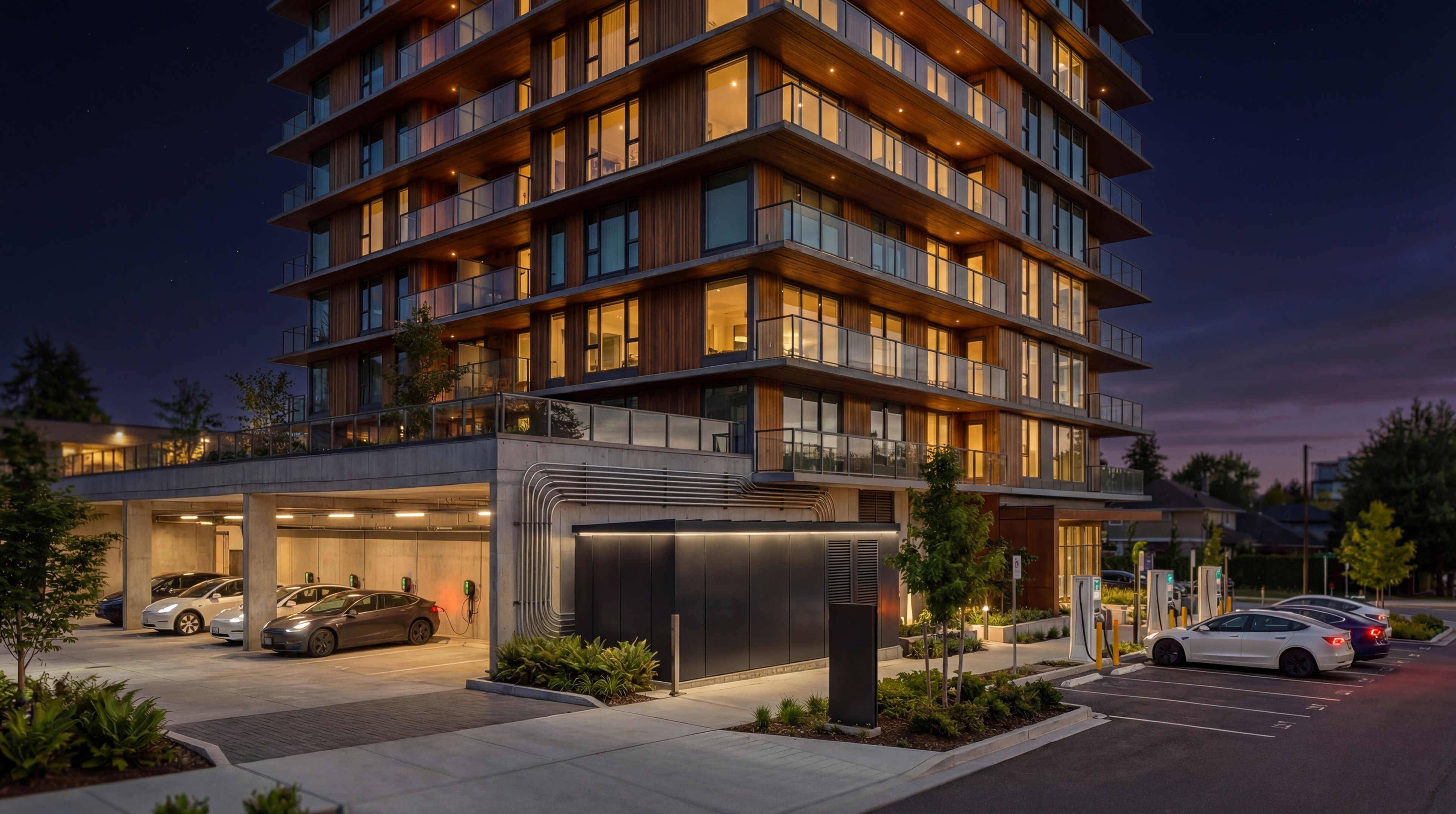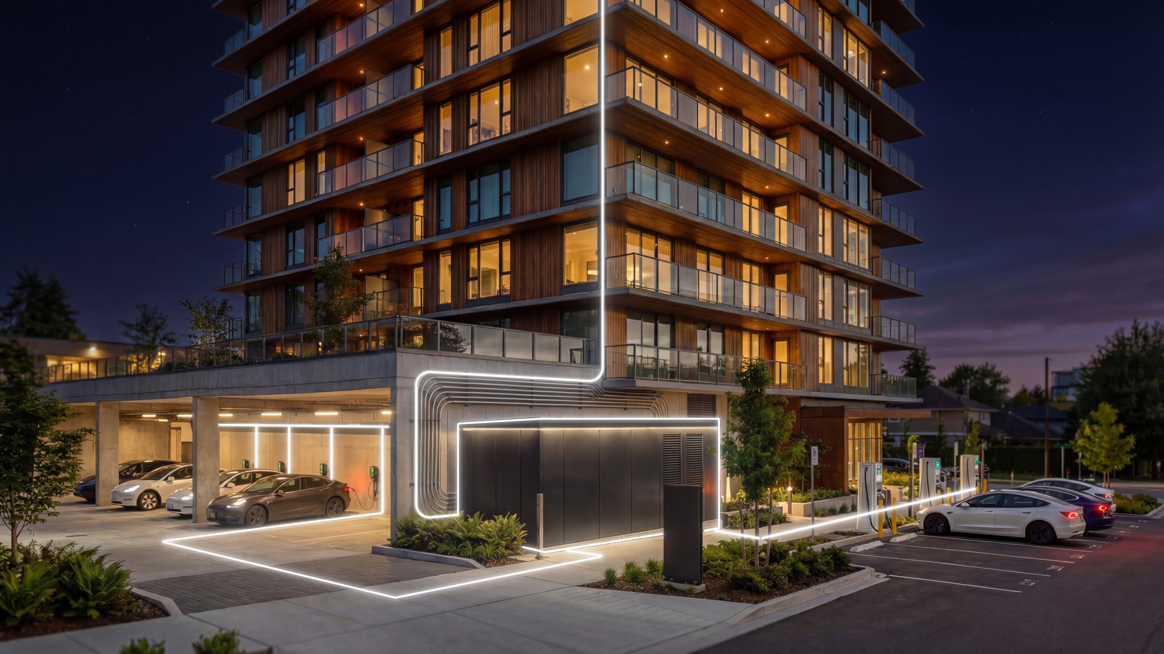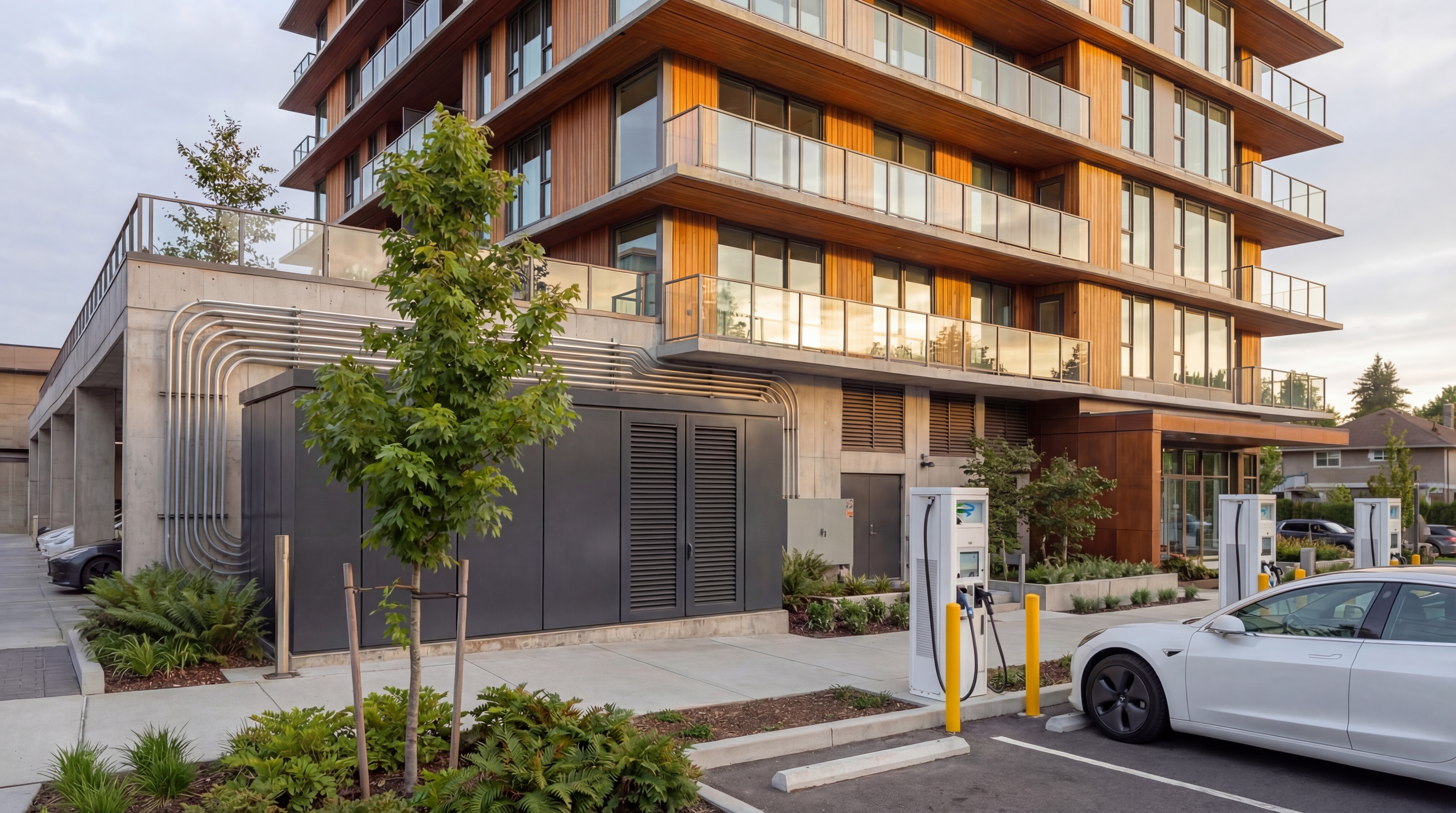 Sleek EV charging along building exterior