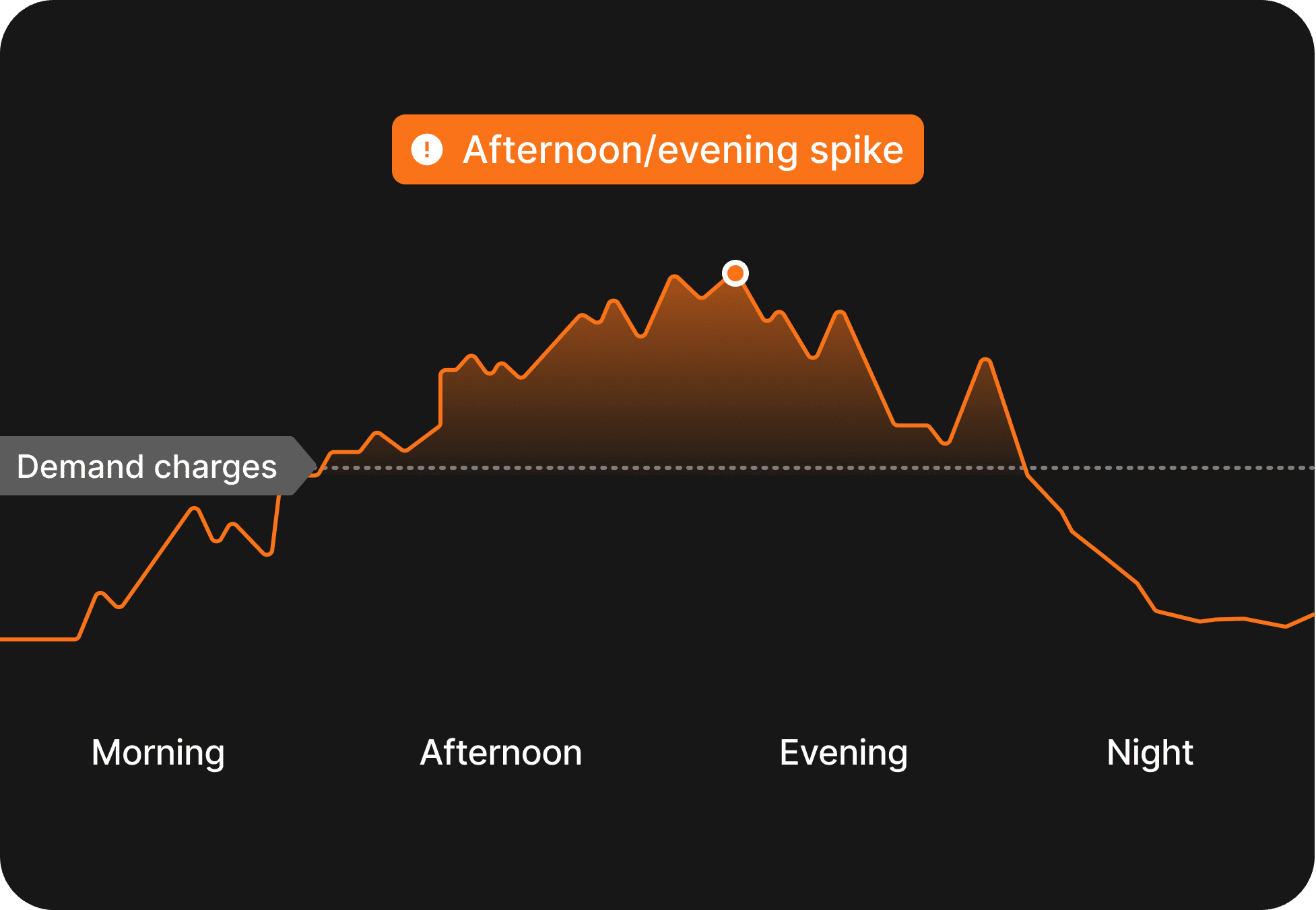 Buildings suffer demand charges under peak load. Without intervention, afternoon and evening spikes lead to expensive fees.